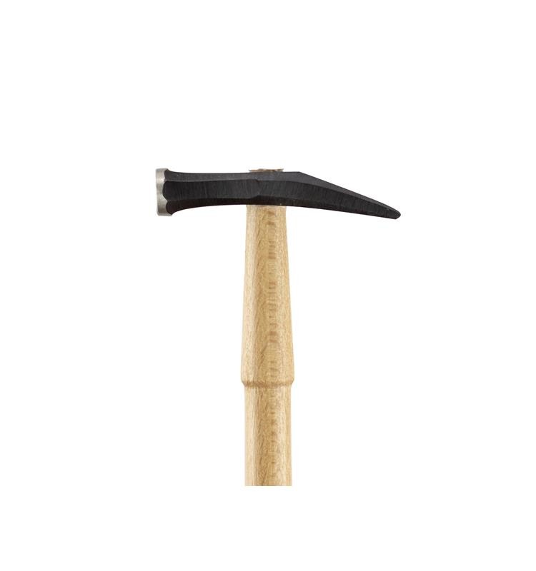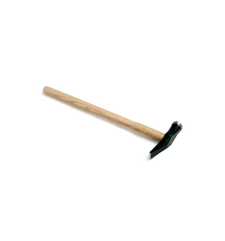 La cabeza dispone de un lado plano y otro cuadrado redondeado, montado sobre un mango de madera.