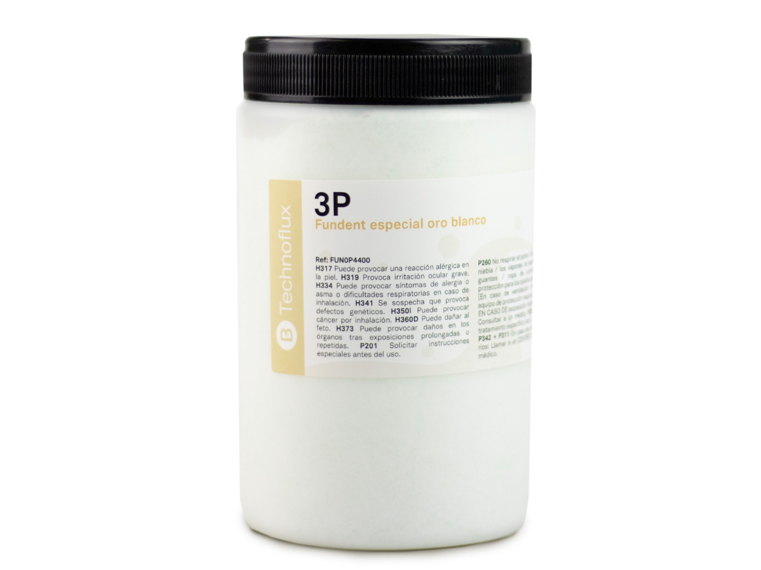 Fundente especial para oro blanco de Technoflux. Se recomienda utilizar la cantidad necesaria para cubrir el metal en cada fundición.