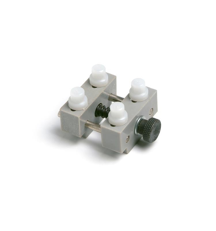 Mordaza fabricada en aluminio para sujetar cajas de reloj con 4 pasadores de plástico.