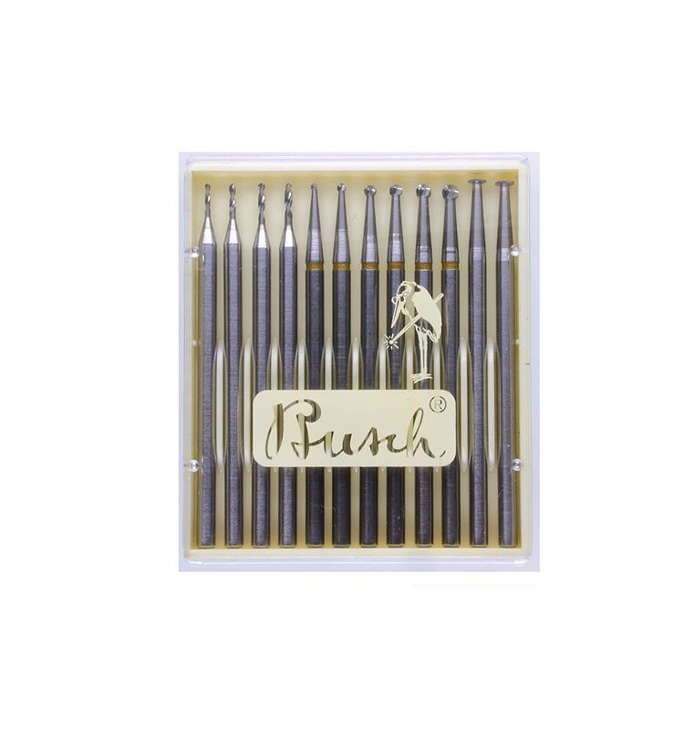 Juego de doce fresas de carburo de tungsteno para engastado Busch. Nos permiten realizar la totalidad de los diferentes modos de engastado. Aptas para trabajar en diferentes tipos de metales. La gran dureza que proporciona su fabricación en carburo hace que destaquen por la precisión y alta calidad de corte.