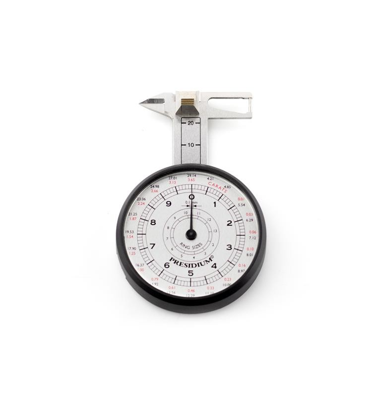 El calibre analógico Leveridge de Presidium es capaz de medir de 0.0 a 23 mm con una precisión de 0.1 mm. Presenta una escala de milímetros y quilates de fácil lectura, y combina mediciones duales para gemas en milímetros con la correspondiente conversión en quilates para gemas redondas de talla brillante.