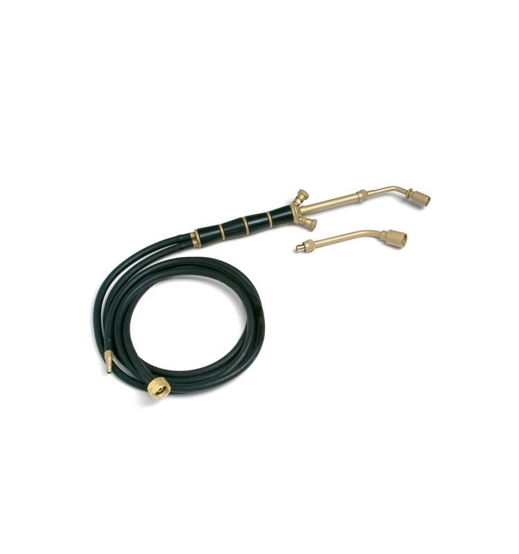 Incluye además dos boquillas patentadas por la marca, que proporcionan una llama concéntrica de excelente valor térmico. Las mangueras se conectan al cuerpo del soplete, incluyendo un terminal para aire de un cuarto con forma de espiga y un terminal giratorio para gas. Este último evita que las mangueras se enrollen durante el montaje.