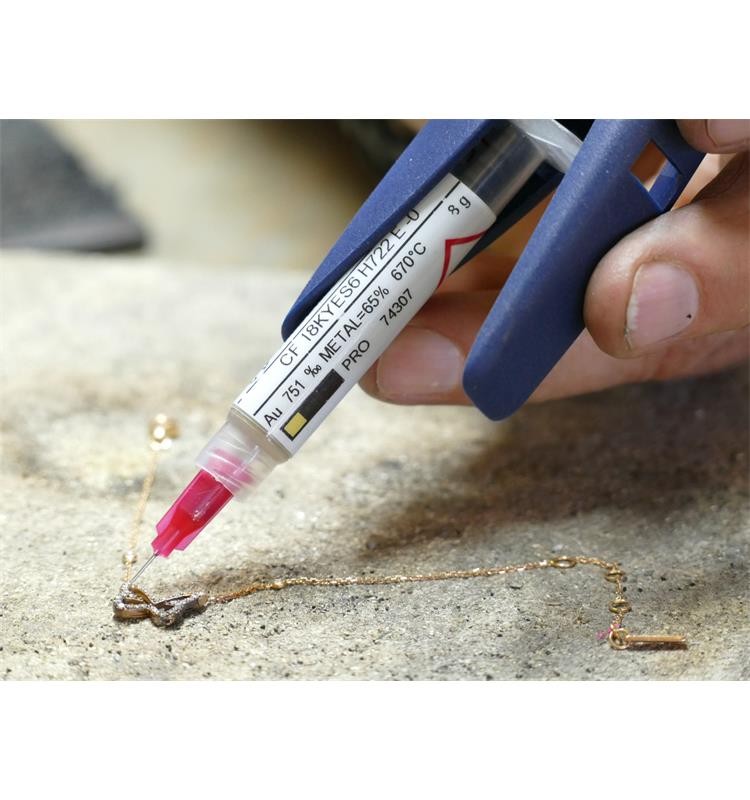Válido para jeringas estándar de 3 c.c, con un contenido máximo de 8 g de pasta de soldadura de plata. Pueden utilizarse todas las agujas estándar de diámetros internos de 0,25 mm a 1,2 mm.