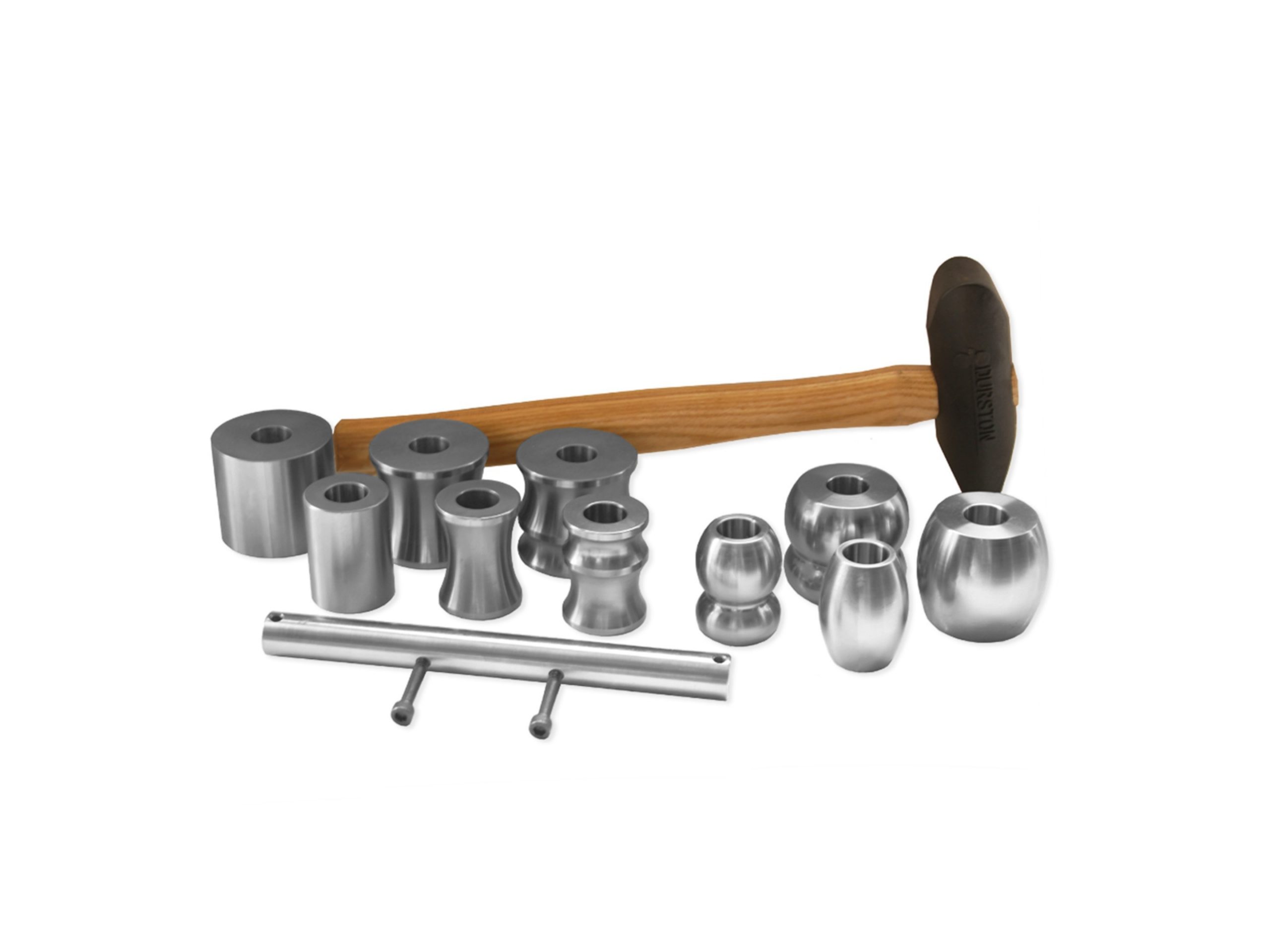 Puede formar brazaletes planos, cóncavos, convexos y anti clásticos. El juego incluye un total de diez matrices en acero de primera calidad que han sido templados y pulidos hasta lograr un alto brillo. El soporte para sujeción en el tornillo de banco y el martillo formador nos permitirá batir el metal, permitiéndonos infinidad de formas y combinaciones.