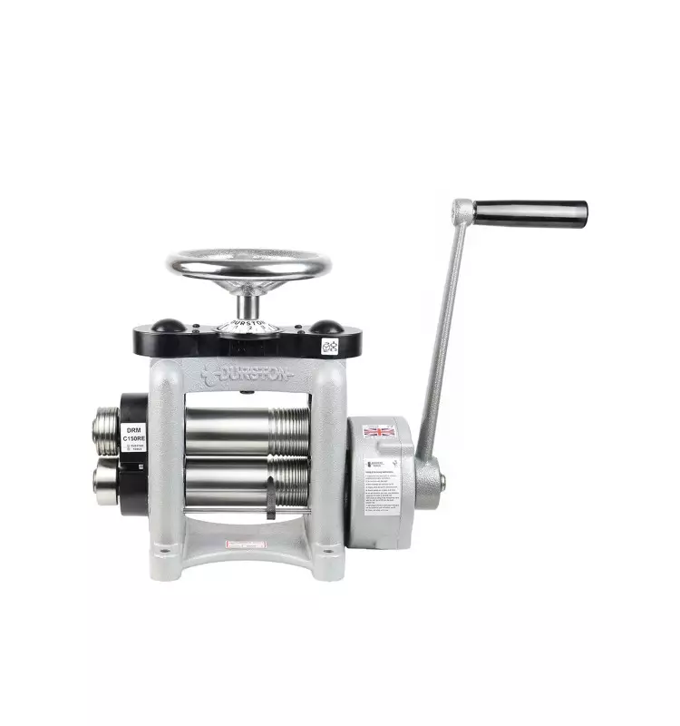 El DMR C150RE de Durston es un laminador de gama alta para cualquier profesional de la joyería. El molino está construido de una sola pieza de hierro fundido para máxima resistencia y rigidez. La longitud del rodillo de 150 mm, significativamente más ancha que en la mayoría de los molinos, ofrece espacio adicional para una gran área de laminación plana, así como 11 ranuras para alambre. Cada rodillo está especialmente endurecido por inducción a 64 RC. El espesor máximo para el laminado plano es de 6 mm y las 11 ranuras de alambre cuadradas varían de 8 mm a 1 mm.