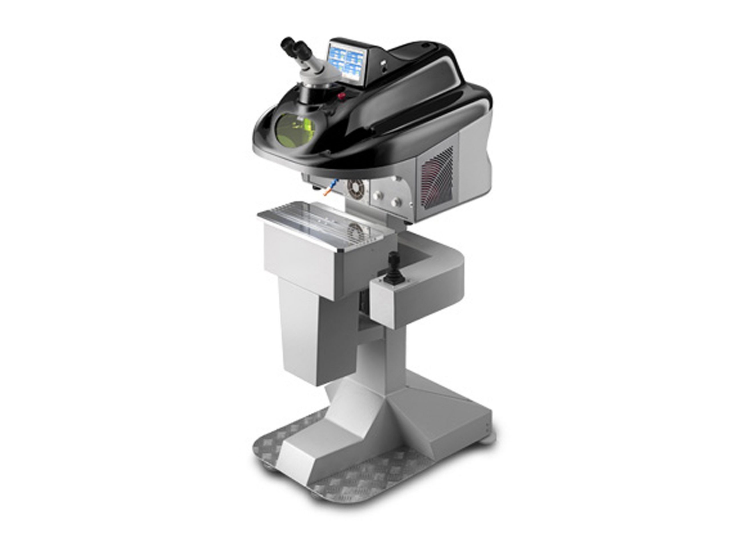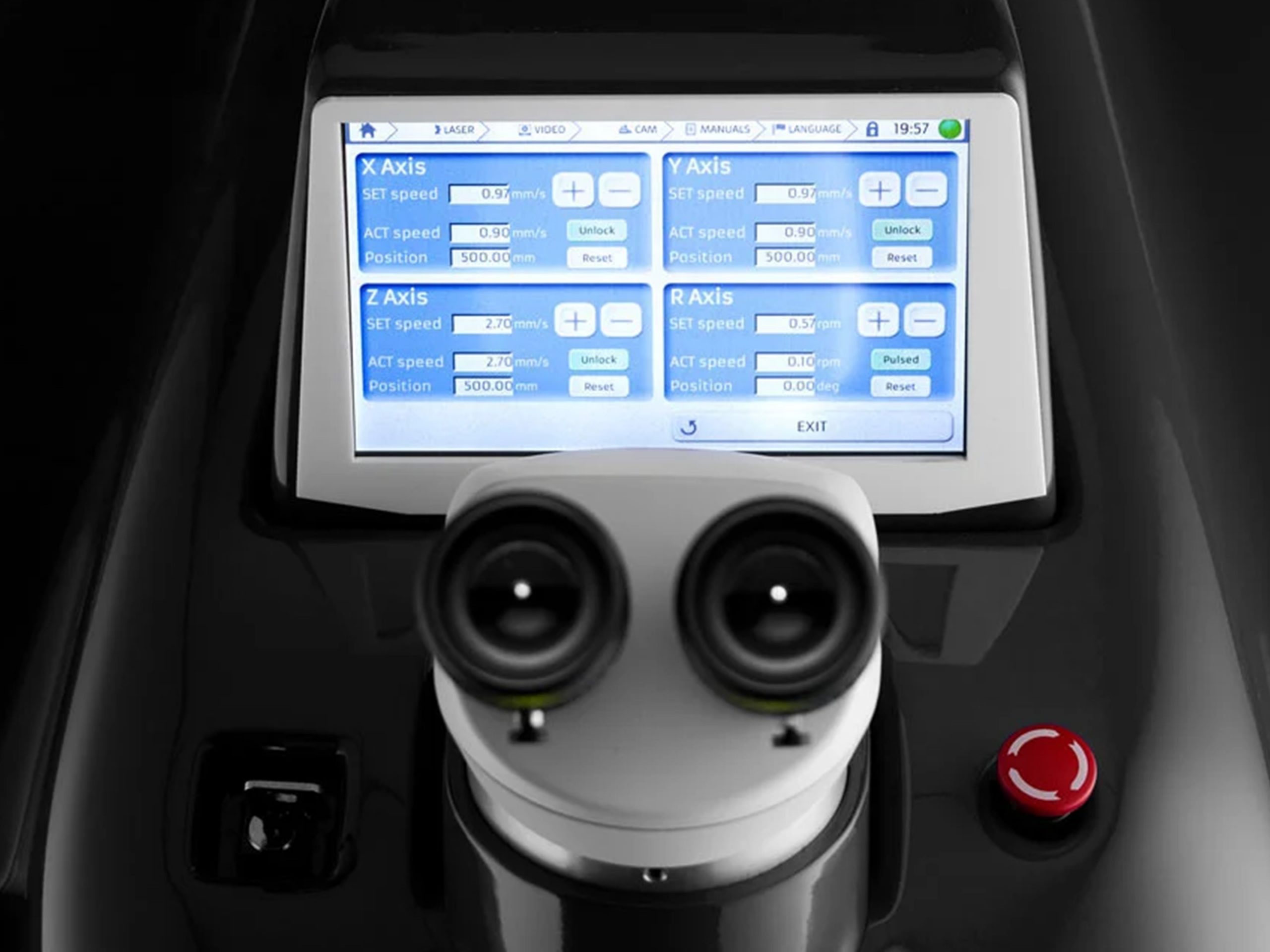 Está equipada con una mesa motorizada de tres ejes controlada por un joystick con todas las funciones a bordo, incluido el botón de disparo y el ajuste del eje rotativo, suministrado como opción para soldadura circular.
