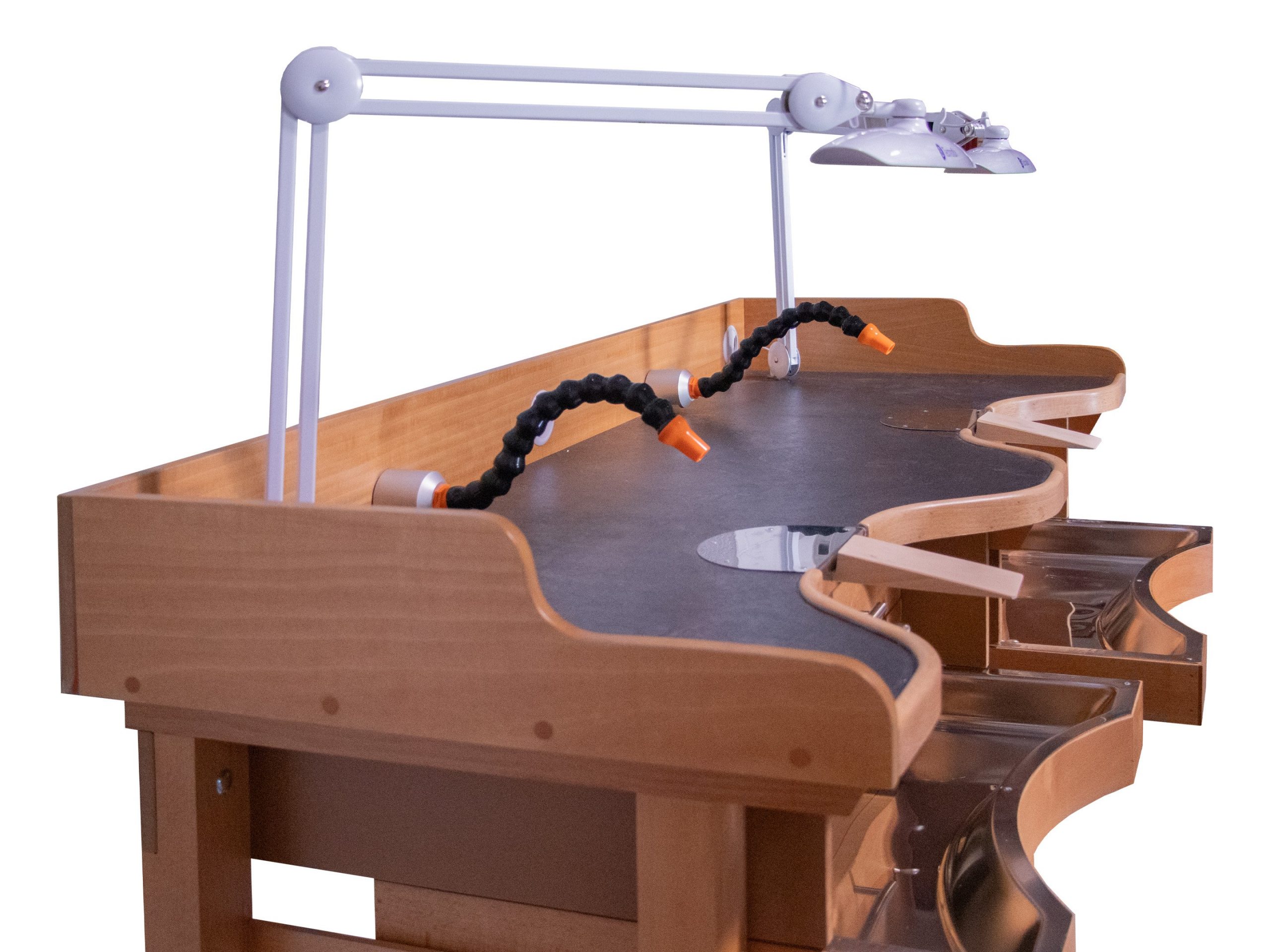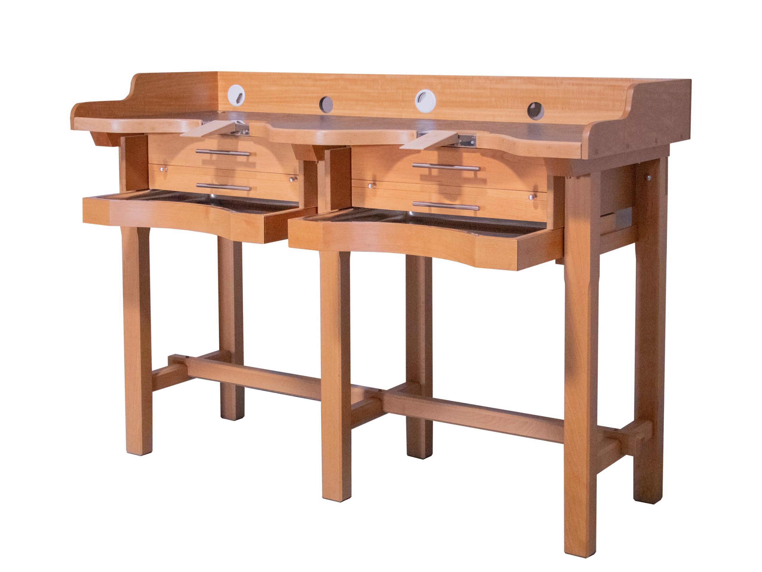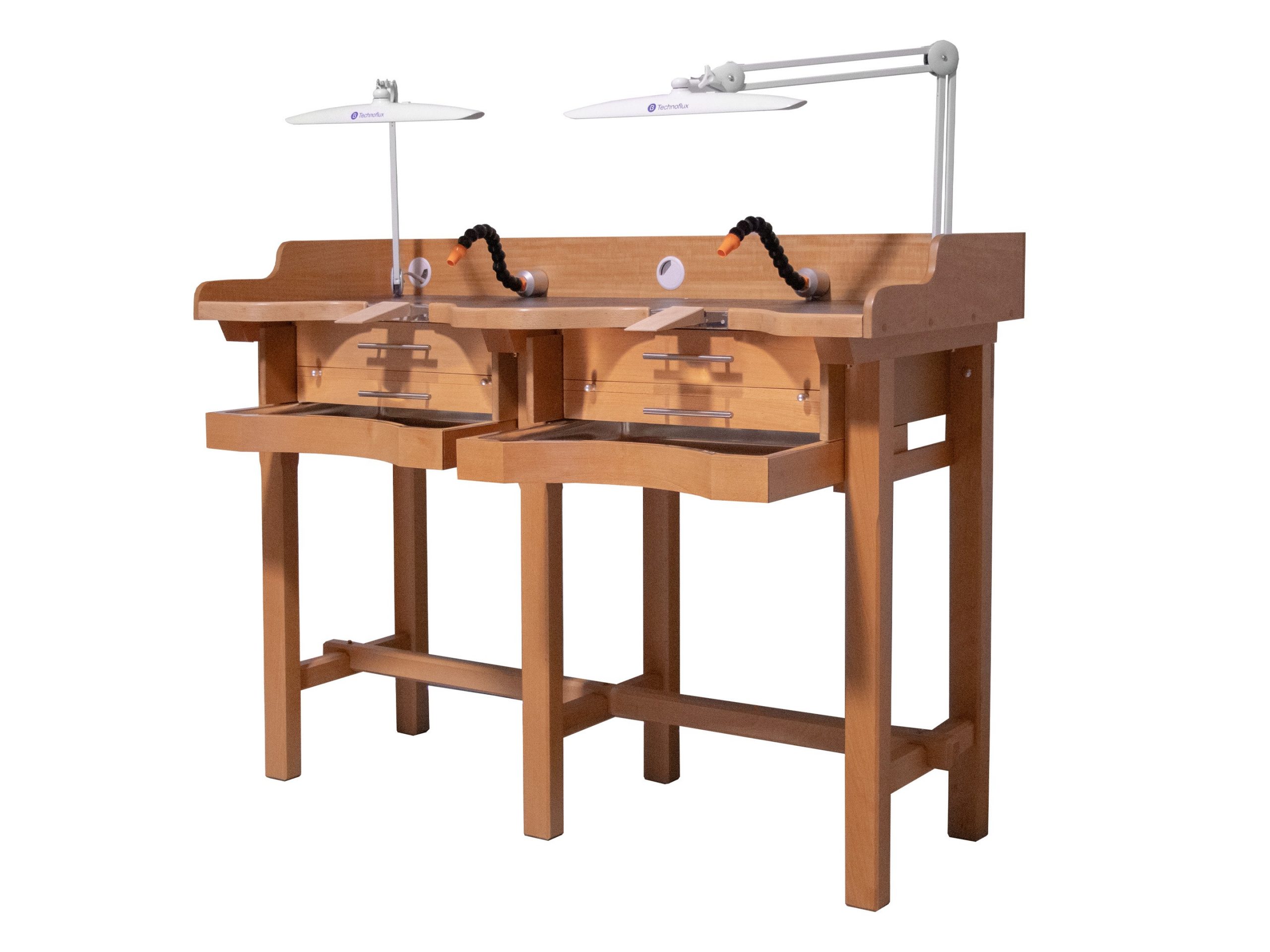 Mesa de trabajo joyero Premium de 2 puestos, de última generación, diseñada para ofrecer un entorno de trabajo más saludable, cómodo y organizado.