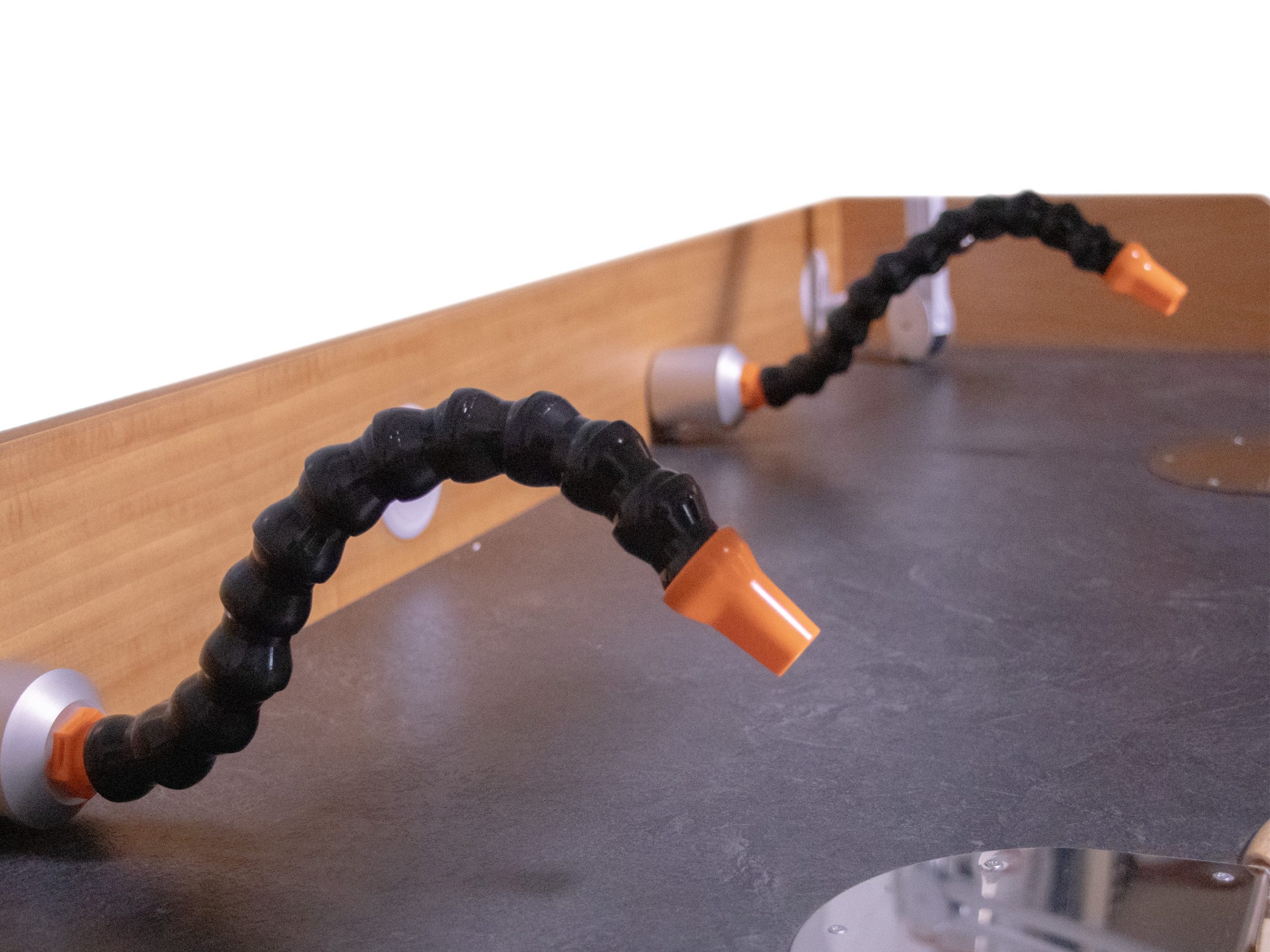 ? Soporte Foredom con toma de aspiración, astillera, pantalla protectora y reposabrazos ajustables.