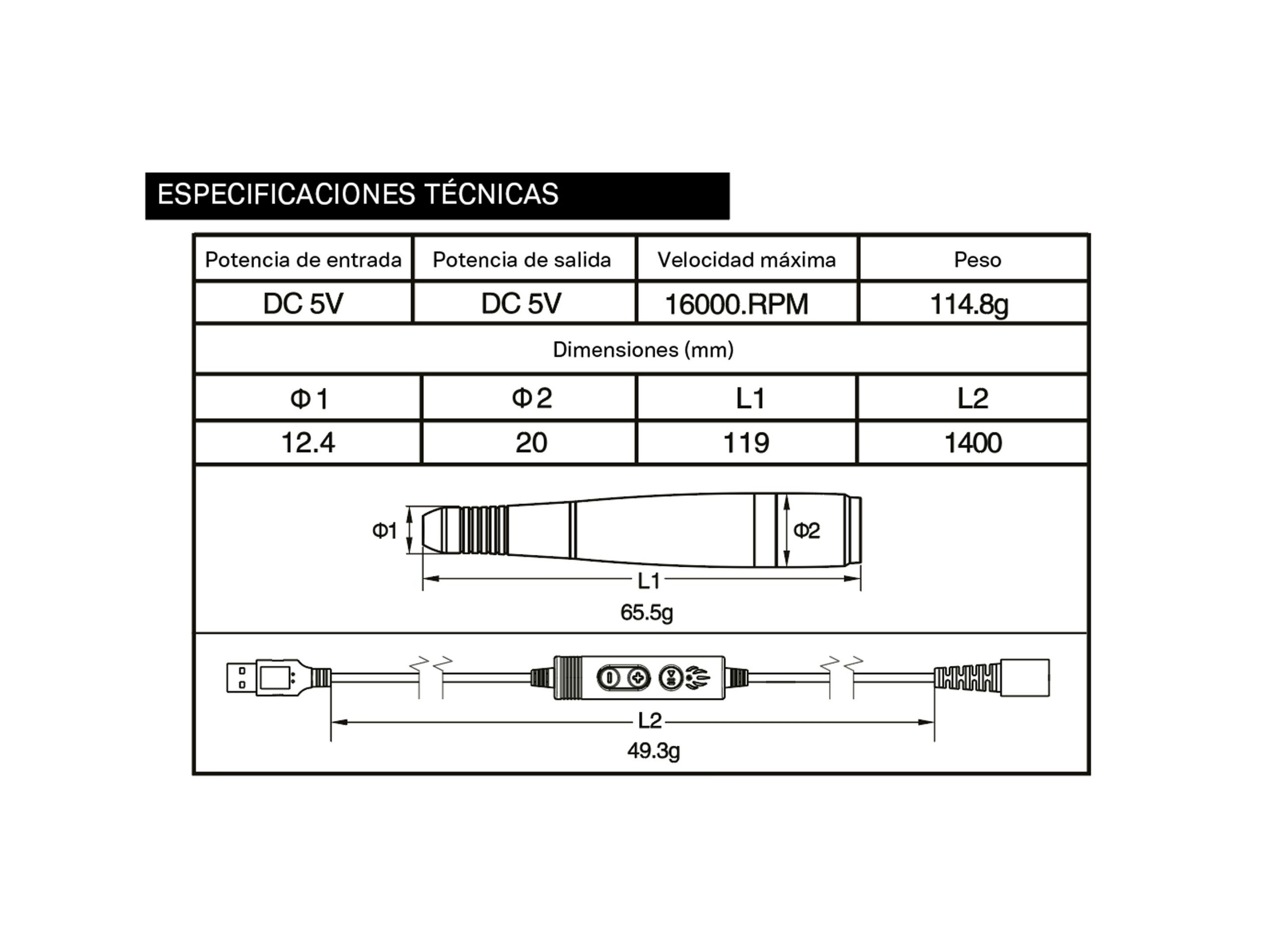 Económico micromotor de escobillas, velocidad máxima 16.000 RPM, portátil con conexión USB.