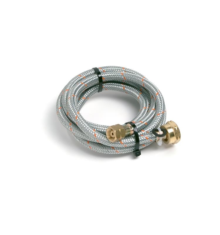 Manguera racorada de 2 metros de longitud, con una funda de acero trenado. Esta funda protege la manguera de cualquier salpicadura de metal y evita que se deteriore.