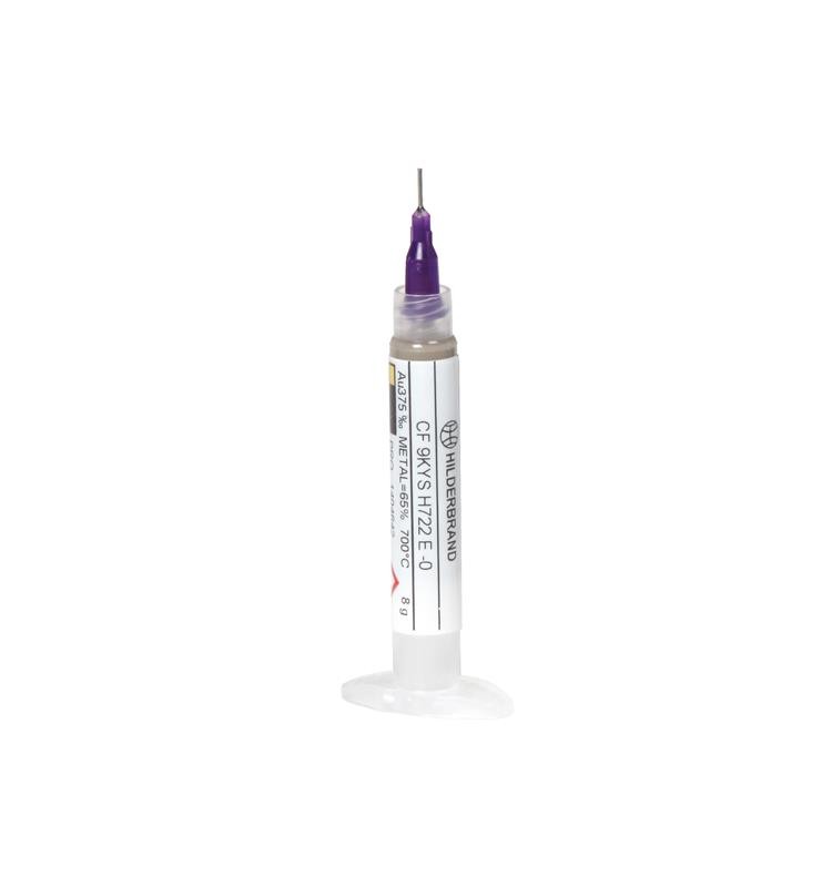 Pasta de soldadura para oro de 9 k de Hilderbrand. Puede ser utilizada en distintas zonas de las piezas a soldar, con la única aplicación de calor y un solo tipo de soldadura. Su composición evita el riesgo de pérdida por desprendimiento al aplicar la llama directamente, ya que la soldadura queda adherida a la pieza.