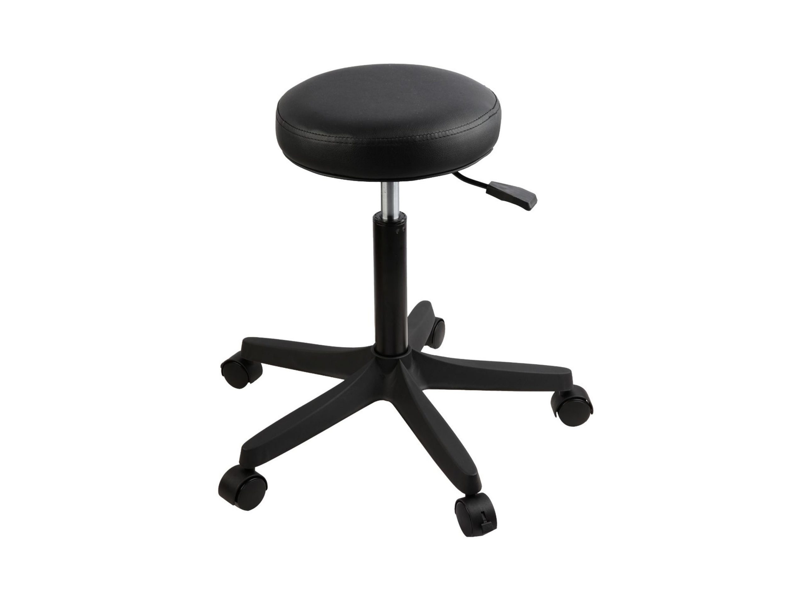 Taburete acolchado de altura regulable mediante pistón hidráulico. De 52-70 centímetros de altura. Cinco patas con ruedas.