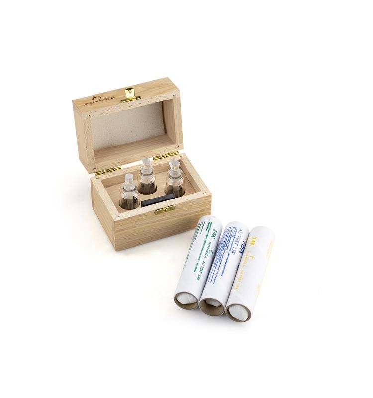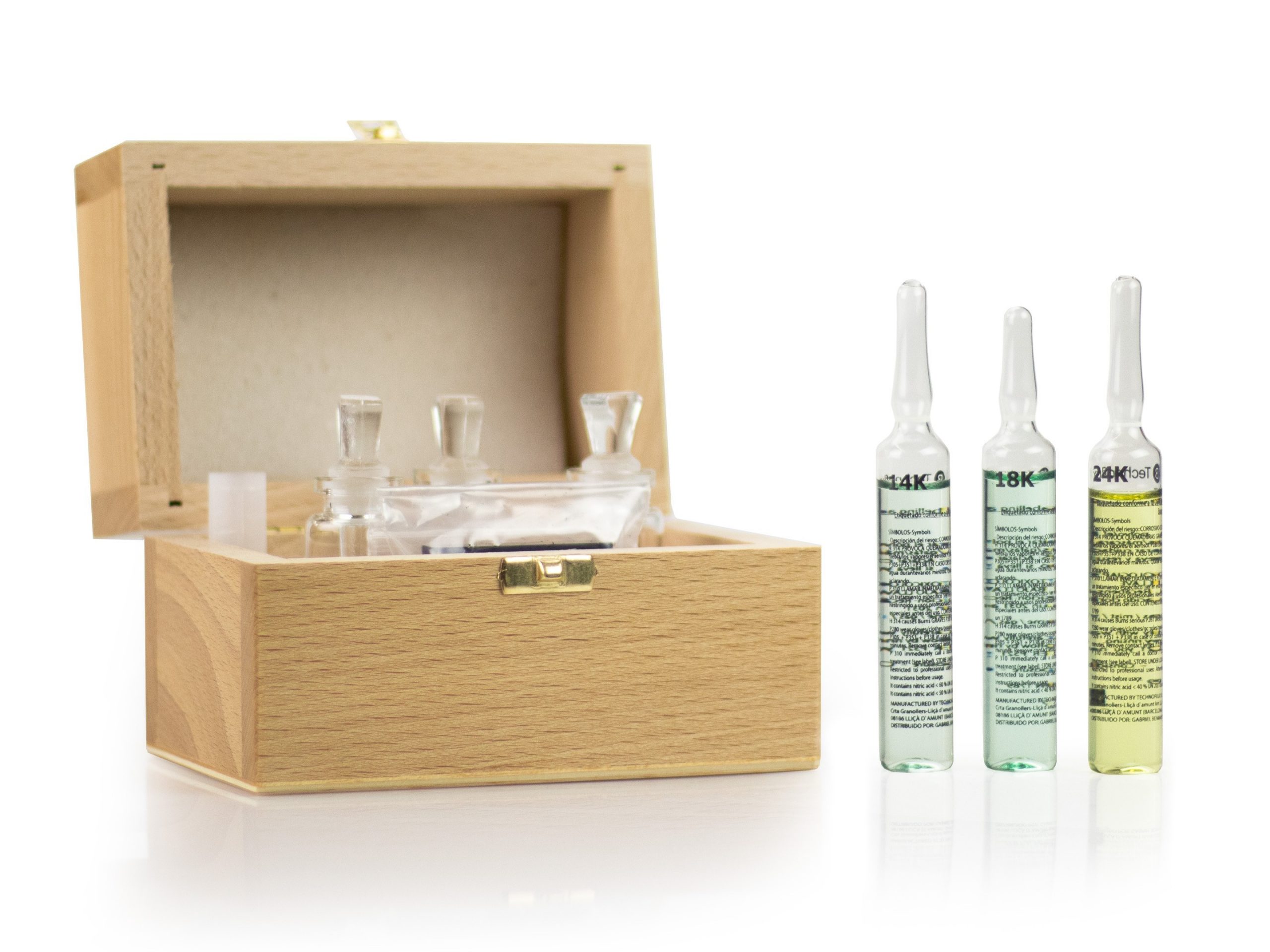 Set de 3 aguas de toque con estuche de madera, frascos y piedra de toque. Mediante el uso de este set es posible determinar de forma rápida y segura el quilataje de la pieza a analizar.