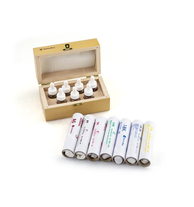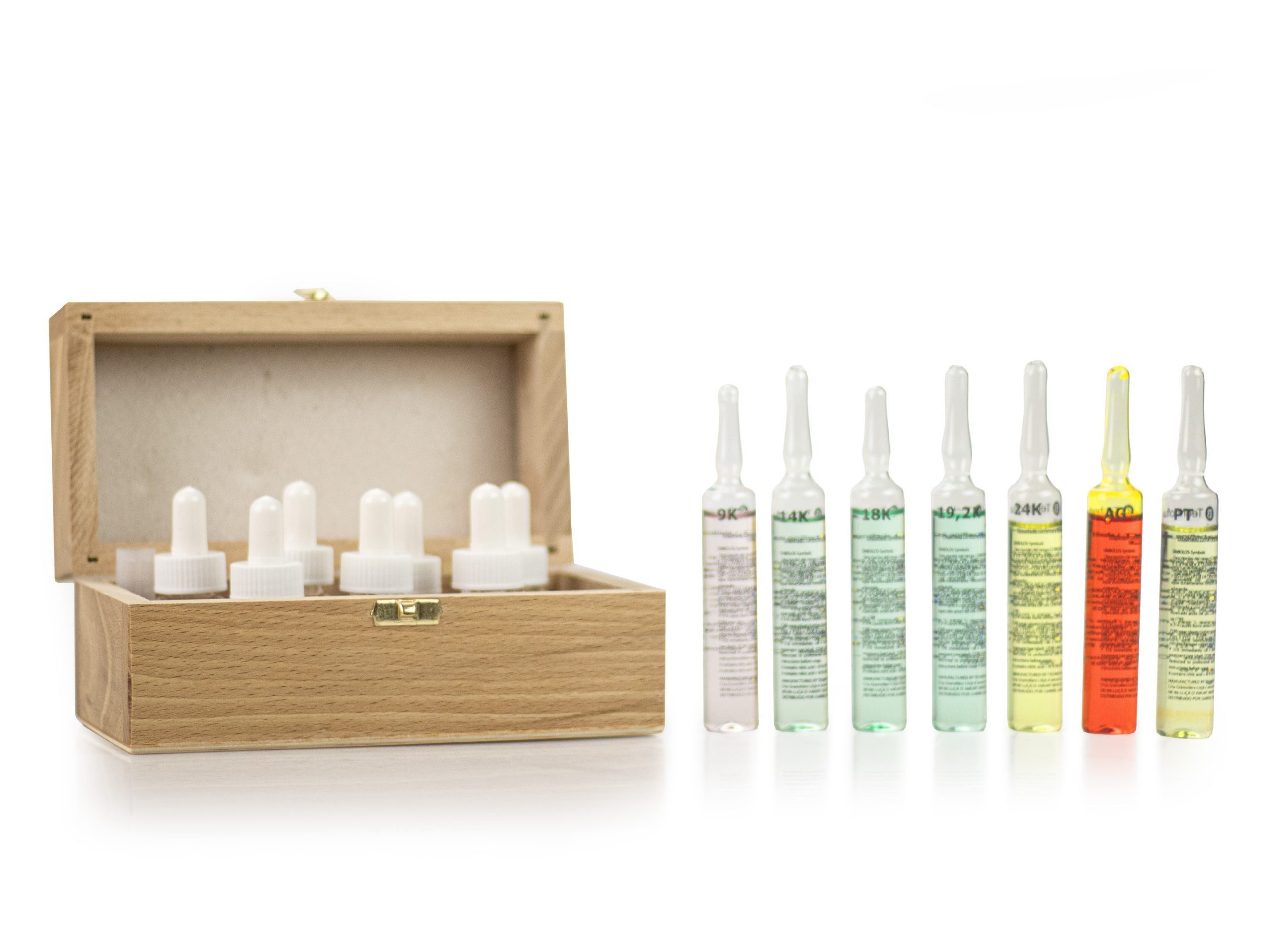 Siete aguas de toque con frascos de cristal para determinar el quilataje de diferentes metales. Los resultados se aprecian de forma visual, se recomienda el uso de guantes y gafas protectoras.Unidad de venta: Un set